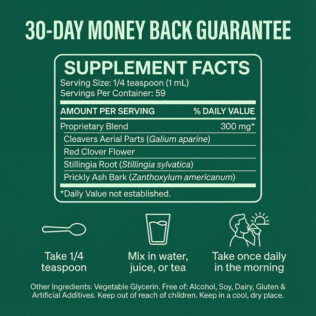 Nuflos is a premium 4-in-1 herbal formula combining Cleavers, Red Clover, Stillingia Root, and Prickly Ash Bark. Together, they help clear lymph congestion, reduce bloating, boost energy, and restore mental clarity.