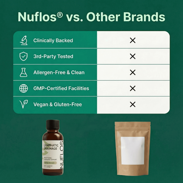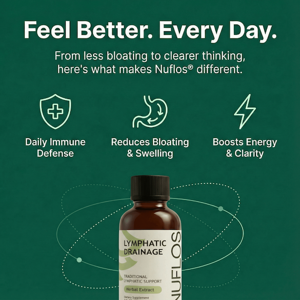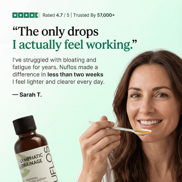 Research shows our lymphatic systems are under more stress than ever before. Processed foods, sedentary lifestyles, and chronic stress are clogging the body's natural drainage pathways. Nuflos is formulated with 4 clinically-studied herbs traditionally used to support healthy lymph flow, so your body can flush what it's been holding onto and feel lighter from the inside out.
